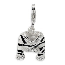 Looking for an exotic print jacket? Then this Sterling Silver CZ Polished Enamel Zebra Jacket Charm is for you! This piece makes a great addition to any charm bracelet.Size: 15 mm long x 14 mm wideMetal: Sterling SilverRhodium PlatingProfile Type: 3-DStone: Cubic Zirconia (CZ)3-D, Enamel, Rhodium-platedFree U.S. Shipping for orders over $50 Protected by our 30-Day Risk Free Returns!