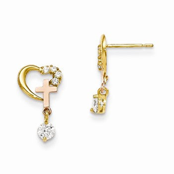 14k Yellow Gold CZ Childrens Cross Heart Post Earrings