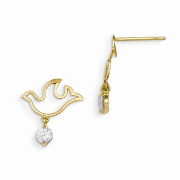 14k Yellow Gold CZ Childrens Dove Dangle Post Earrings