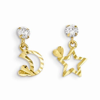 14k Yellow Gold CZ Diamond-cut Childrens Star and Moon Dangle Post Earrings
