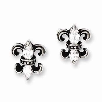 Stainle Steel Antiqued Fleur de lis with CZ Post Earrings