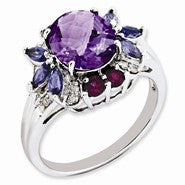 Sterling Silver Rhodolite Garnet, Amethyst, Iolite & Diamond Ring
