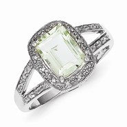 Sterling Silver w/Rhodium Emerald-cut Green Quartz & Diamond Ring