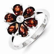 Sterling Silver w/Rhodium Garnet & Diamond Flower Ring