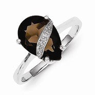 Sterling Silver w/Rhodium Pear Smokey Quartz & Diamond Ring