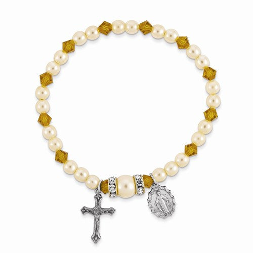 November Crystal & Faux Pearl Stretch Miraculous & Crucifix Bracelet