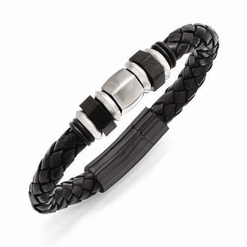 Stainless Steel Brushed Leather Black Ip-Plated & Rubber Bracelet