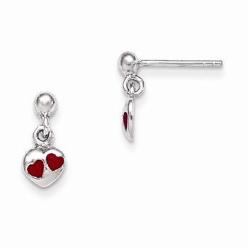 Sterling Silver RH Plated Childs Red Enameled Heart Dangle Earrings