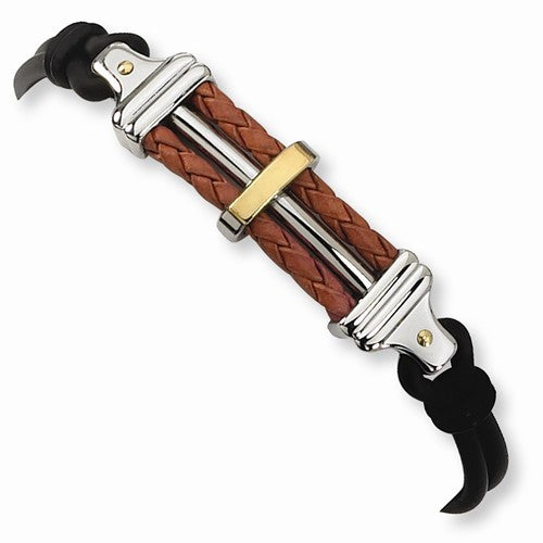 Stainless Steel Black Rubber & Brown Leather 18K Gold Accent Bracelet