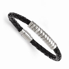 Stainless Steel Polished Design and Black Woven Leather Bracelet