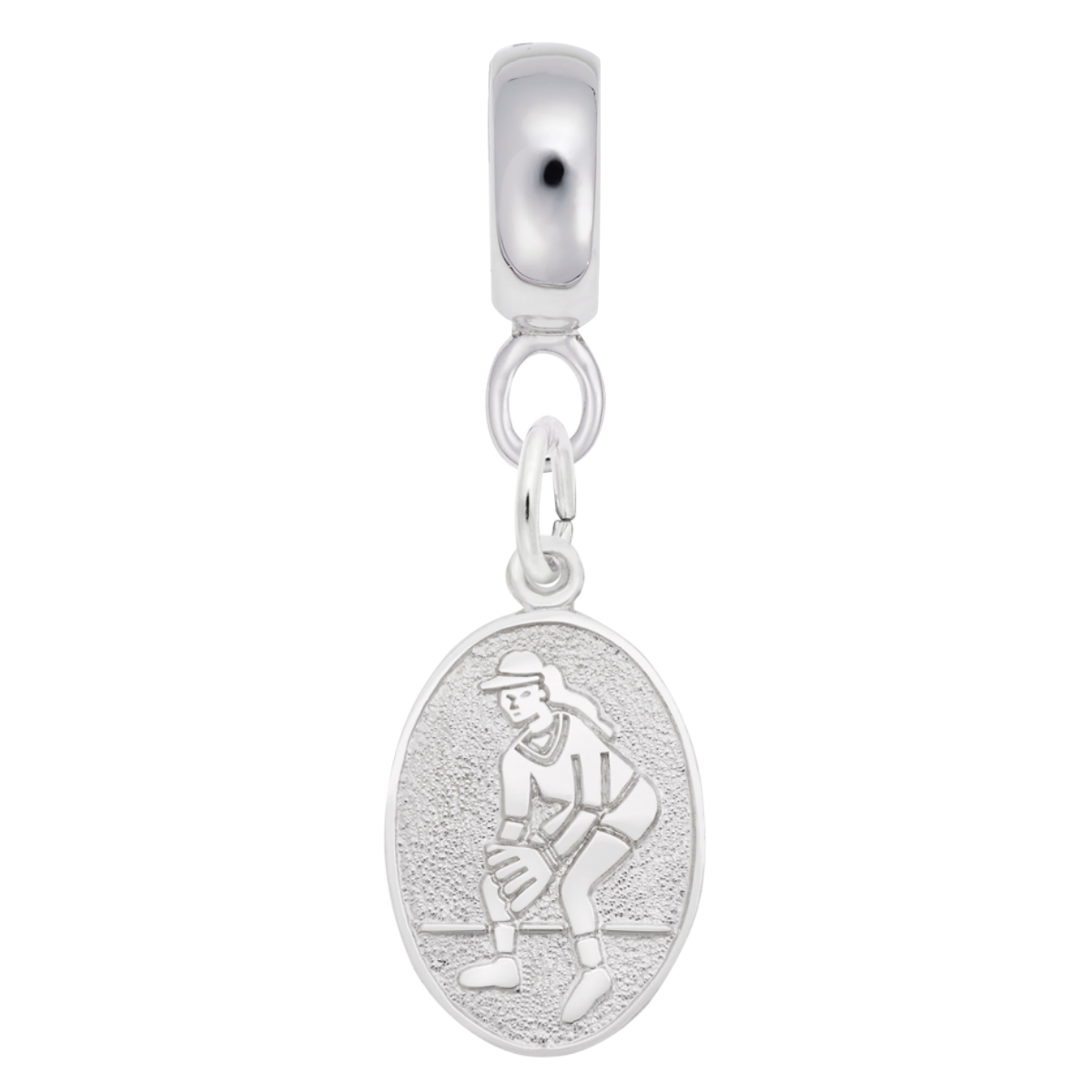 Love playing softball? Then this Sterling Silver flat back engravable female softball charm dangle bead suits you. Make it an addition to your collection today!