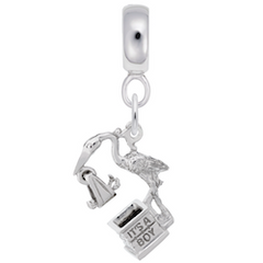 Protected by our Lifetime Warranty!If the baby is a boy, why not let the stork announce it! Add this Sterling Silver 3D stork boy charm dangle bead to your collection today!Rounded Charmdrop Hole Size Diameter: 4.6 MMCharm Height: 3/4 in. ~ (18.07 mm) Charm Width: 1/2 in. ~ (11.67 mm) Sterling Silver Charm Dangle Beads for Bracelets & NecklacesFits most...