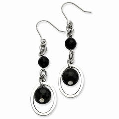 Stainle Steel Polished Ovals with Black Glass Bead Dangle Earrings