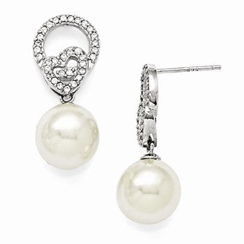 Sterling Silver 10-11mm White Shell Pearl CZ Dangle Earrings