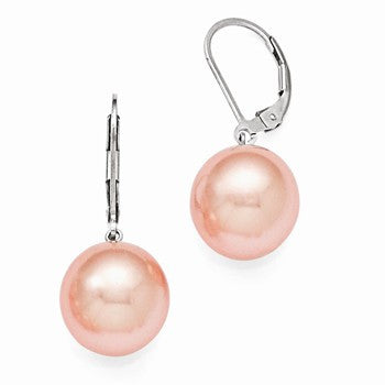 Sterling Silver 12-13mm Round Pink Shell Pearl Leverback Earrings