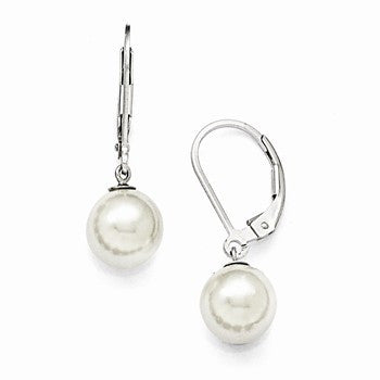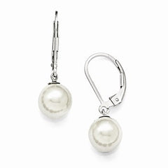 Sterling Silver 8-9mm Round White Shell Pearl Leverback Earrings