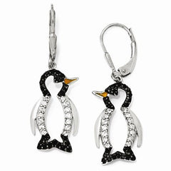 Sterling Silver Enameled Blk Wht CZ Penguin Leverback Earrings