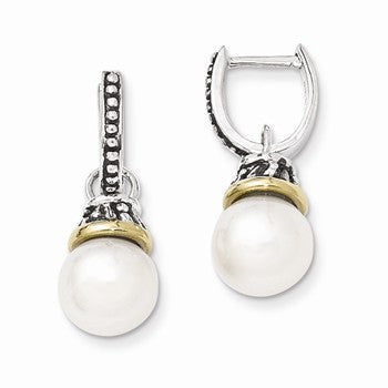Sterling Silver w/14k Yellow Gold 10mm Freshwater Cultured Pearl Dangle Earrings