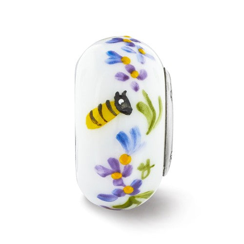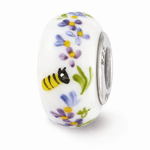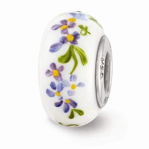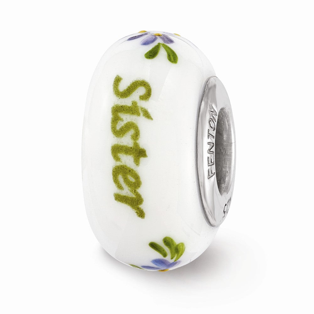 White Hand Painted Sister Floral Glass Charm Bead in Sterling Silver