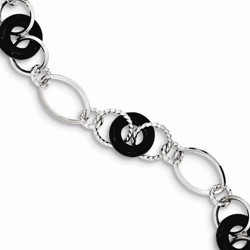 Sterling Silver Rhodium Plated Black Agate Bracelet