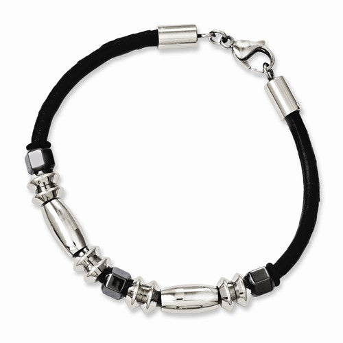 Stainless Steel Leather Polished & Hematite Beads Bracelet