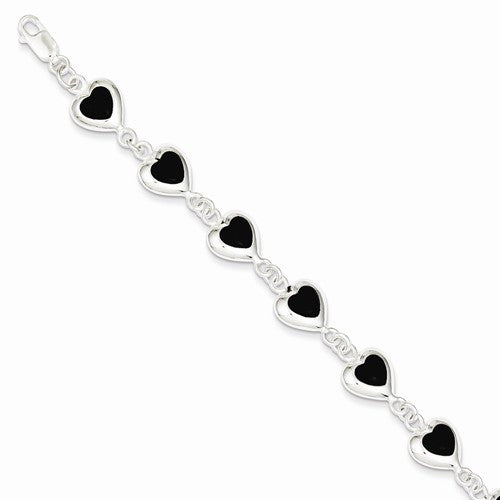 Sterling Silver Fancy Polished Heart Onyx Bracelet