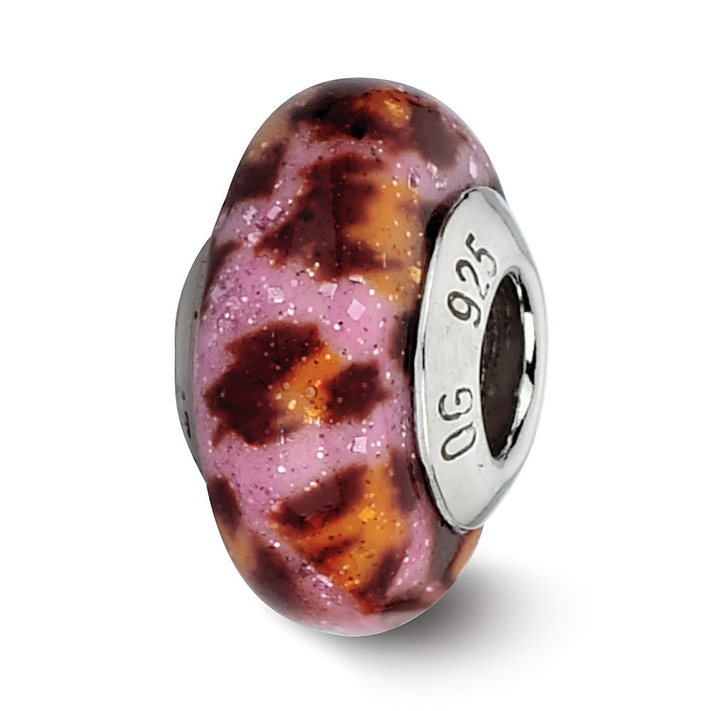 Pink/Brn Jaguar Glitter Overlay Glass Charm Bead in Sterling Silver