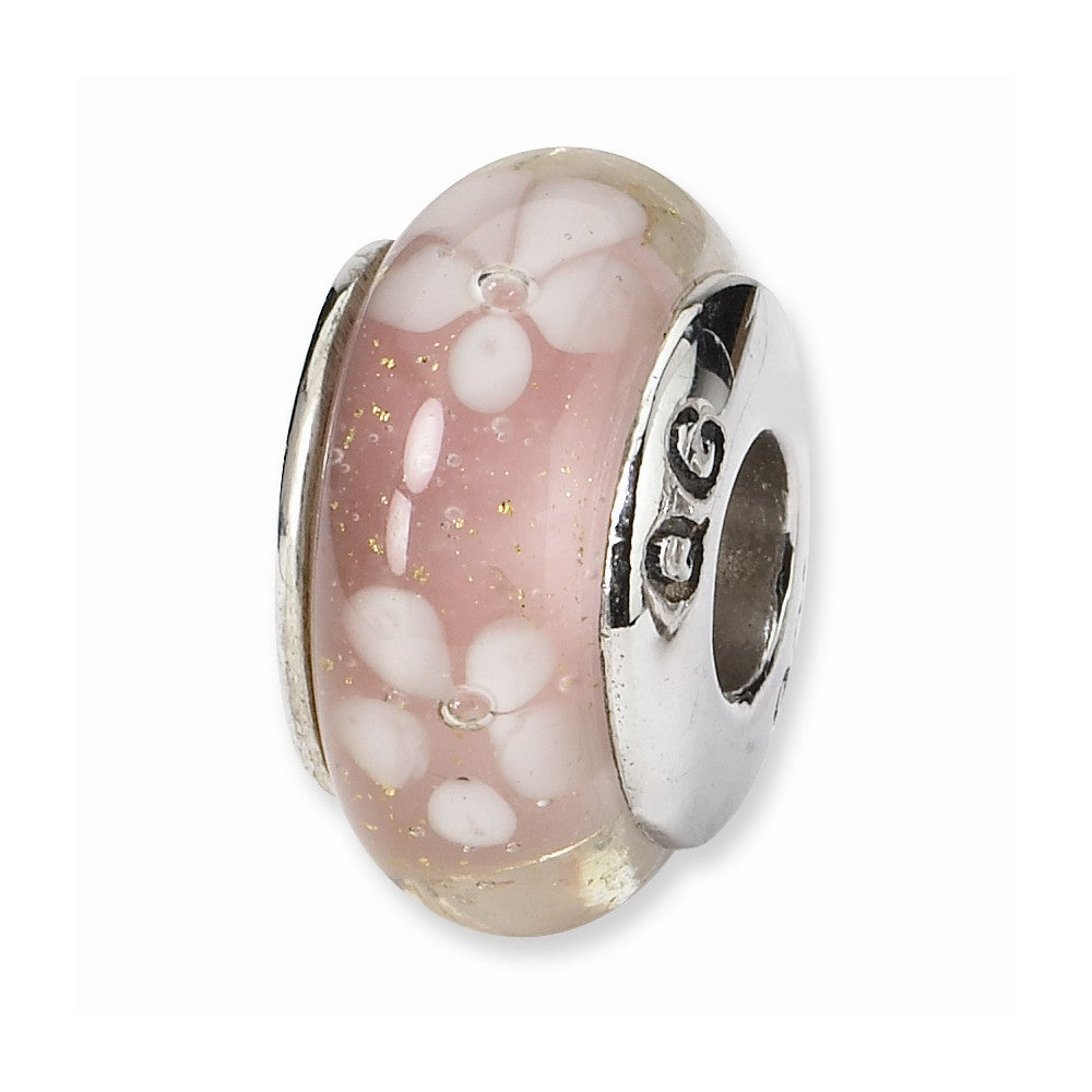Pink/White Floral Hand-blown Glass Charm Bead in Sterling Silver