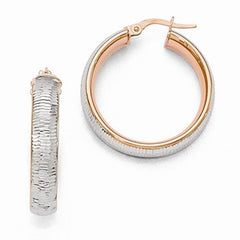 14k Rose Gold w/Rhodium Polished Diamond-cut Hoop Earrings