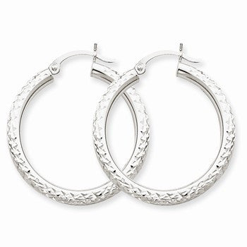 14k White Gold Diamond-cut 3mm Round Hoop Earrings