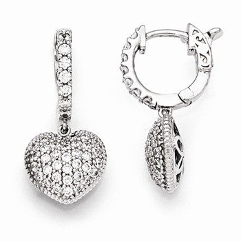 Sterling Silver Rhodium Plated CZ Hinged Hoop Dangle Heart Earrings