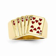 14k Yellow Gold Enameled Royal Flush in Hearts Mens Ring