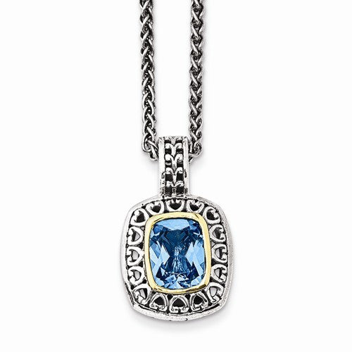 14K Yellow Gold and Silver Antiqued Light Swiss Blue Topaz Necklace