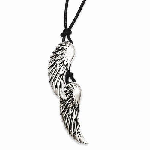 Stainless Steel Antiqued Wings On Black Leather Cord Necklace