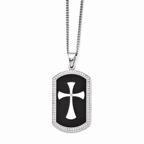 Stainless Steel Black Ip-Plated Polished Dog Tag Cross CZ Necklace