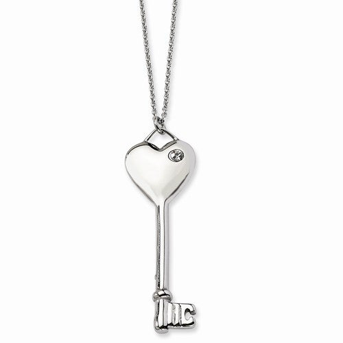 Stainless Steel Heart CZ Key Pendant On Necklace