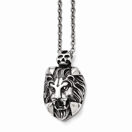 Stainless Steel Polished and Antiqued Lion and Skull Necklace