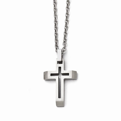 Stainless Steel Polished and Brushed Cut-Out Cross Necklace