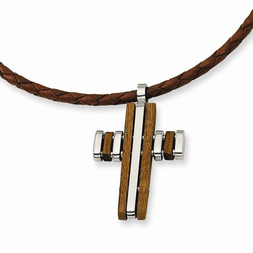 Stainless Steel Wood Accent Cross Pendant On Necklace