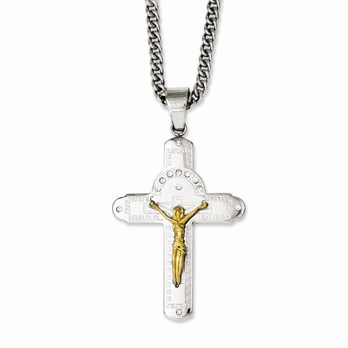 Stainless Steel Yellow Ip-Plated & CZ Polished Crucifix Necklace