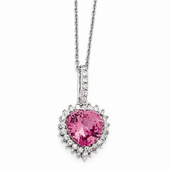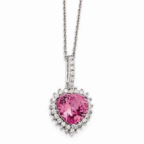 Sterling Silver Facet Heart Synth Pink Sapph, CZ Necklace
