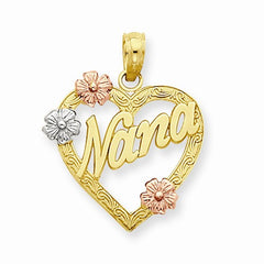 14k Gold Tri-color Nana in Heart with Flowers Pendant, Pendants for Necklace