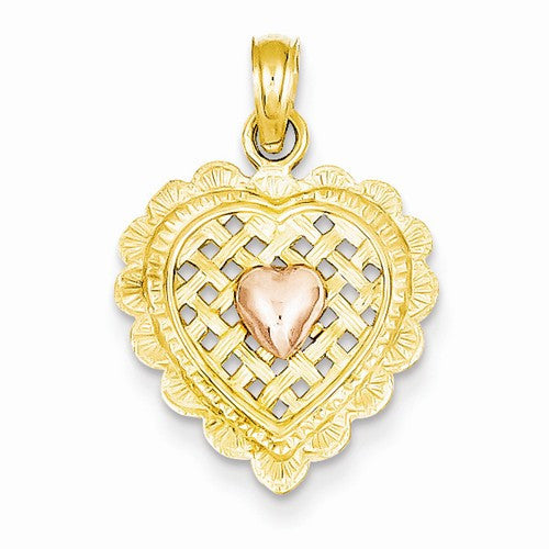 14k Gold Two-tone Pink Heart on Basket Weave Heart Pendant