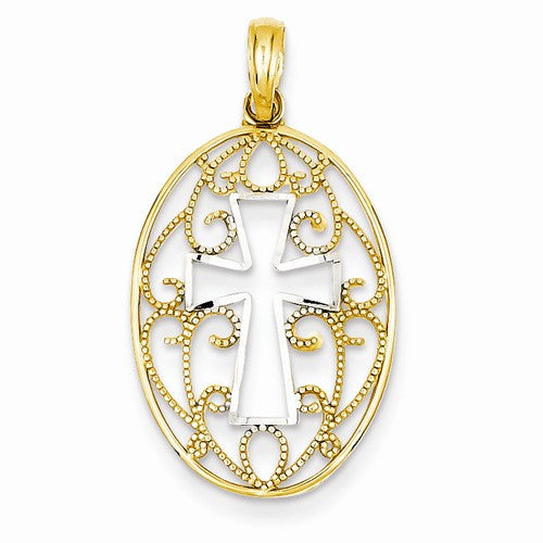 14k Gold w/Rhodium Polished Cross in Oval Pendant