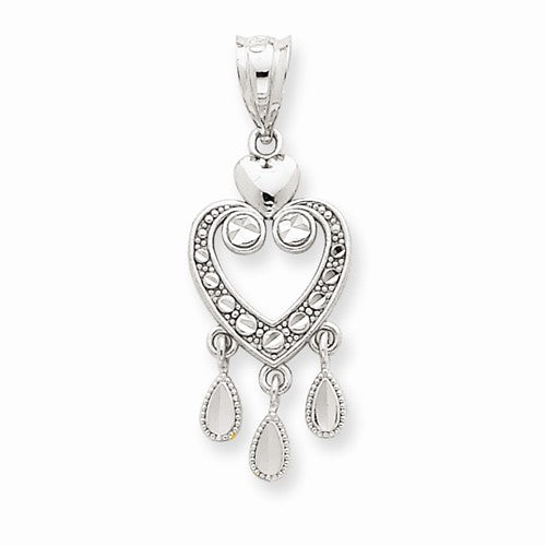 14k White Gold Solid Diamond-cut Fancy Dangle Heart Pendant