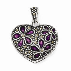 Sterling Silver Marcasite Purple Enamel Flower in Heart Pendant