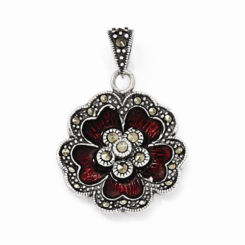 Sterling Silver Marcasite Red Enamel Flower Pendant
