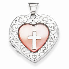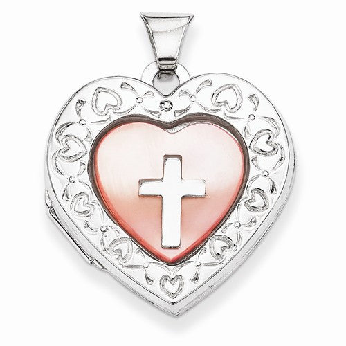Sterling Silver Pink Mother of Pearl with Cross 21mm Heart Locket