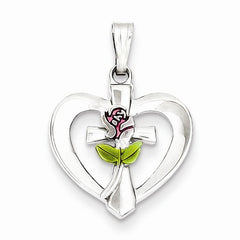 Sterling Silver Polished Enameled Cross & Rose Heart Pendant