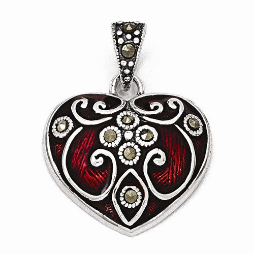 Sterling Silver Red Enamel & Marcasite Heart Pendant